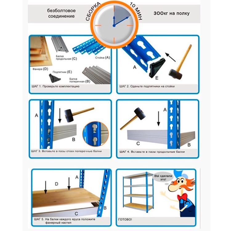 Стеллаж 2000х1525х610 4 полки грузовой, разборный. Стеллажи собираются без болтов с помощью зацепов. Профиль балки МКФ позволяет использовать стеллаж для установки настила из фанеры для хранения продукции в коробках или навалом, а также для хранения автошин от 13" и больше. Стеллажи не собираются в 1 линию с общей стойкой, каждый стеллаж устанавливается отдельно. Вместо настила из фанеры можно изготовить металлические оцинкованные полки. Стеллажи можно использовать как в домашних условиях например гараж или подсобка, а также в торговых или строительных магазинах. Выбирайте грузовые стеллажи из нашего каталога по ваших размерам.